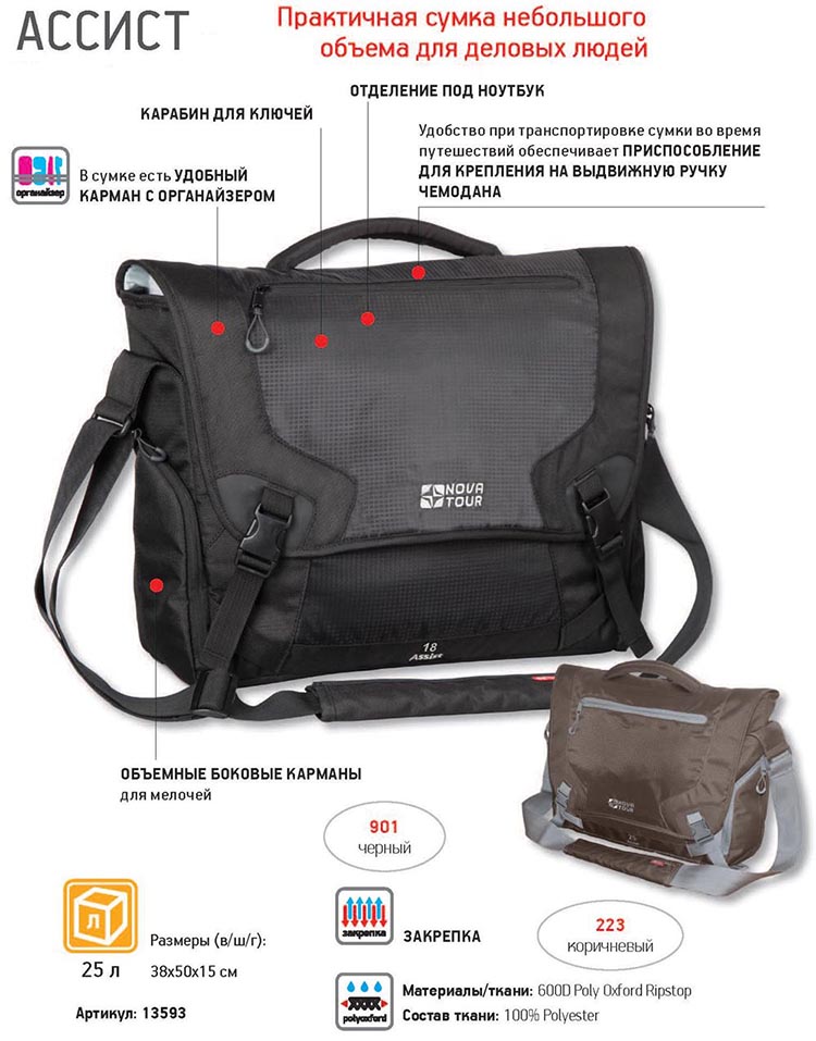 Размеры сумки позволяют переносить даже объемный ноутбук и большое количество документов. В сумке имеется удобный карман с органайзером и объемные боковые карманы для мелочей. Удобство при транспортировке сумки во время путешествий обеспечивает приспособление для крепления на выдвижную ручку чемодана.