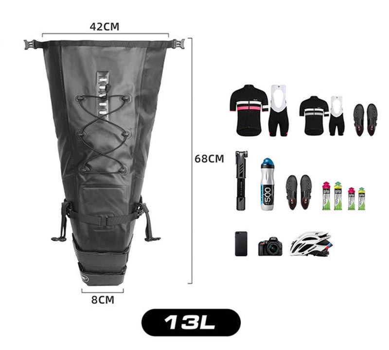 Сумка крепится к подседельному штырю и седлу с помощью прочных ремней и липучек, обеспечивая надежную фиксацию даже на пересеченной местности. Складная конструкция позволяет компактно сложить сумку для хранения или транспортировки, экономя место.