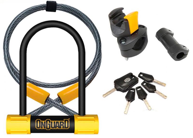 Дуга OnGuard Bulldog Combo DT изготовлена из каленой стали и имеет диаметр 13 мм, что легко позволяет противостоять кусачкам и ножницам по металлу. В комплекте идет поворотное крепление на раму и стальной трос, которым можно зафиксировать оба колеса.Защита 85 баллов из 100 возможных по шкале OnGuard для велосипедных замков. Пять ключей из нержавеющей стали в комплекте (один из них с подсветкой)